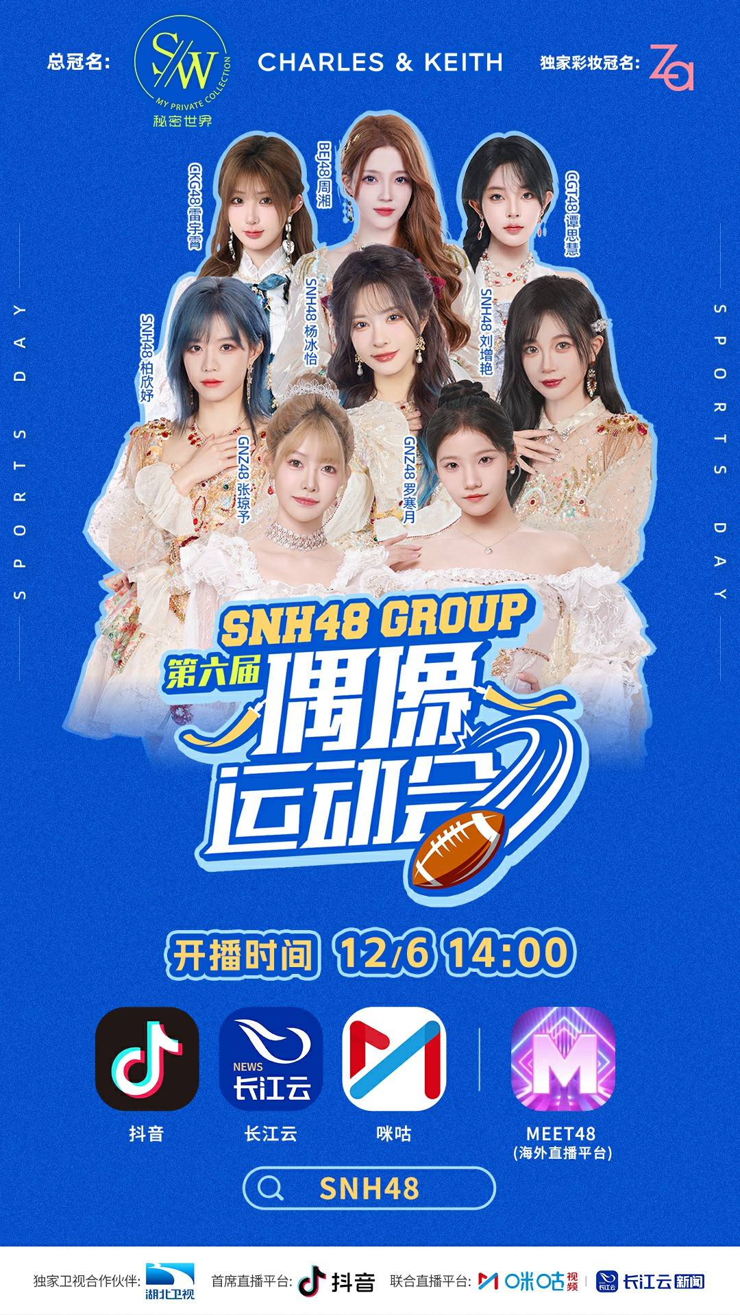 SNH48 GROUP 第六届偶像运动会12月6日14:00即将热血启幕,五团共计64位少女集结武汉·五环体育中心体育馆,开启秋季热血比拼。滑板、趣味腰旗橄榄球、击剑三项全新项目设置引爆赛场荷尔蒙。整场赛事将于抖音、湖北卫视长江云及咪咕视频、Meet48 APP同步直播,12月7日专属见面会也将同步开启,场内场外共同体验运动时刻。